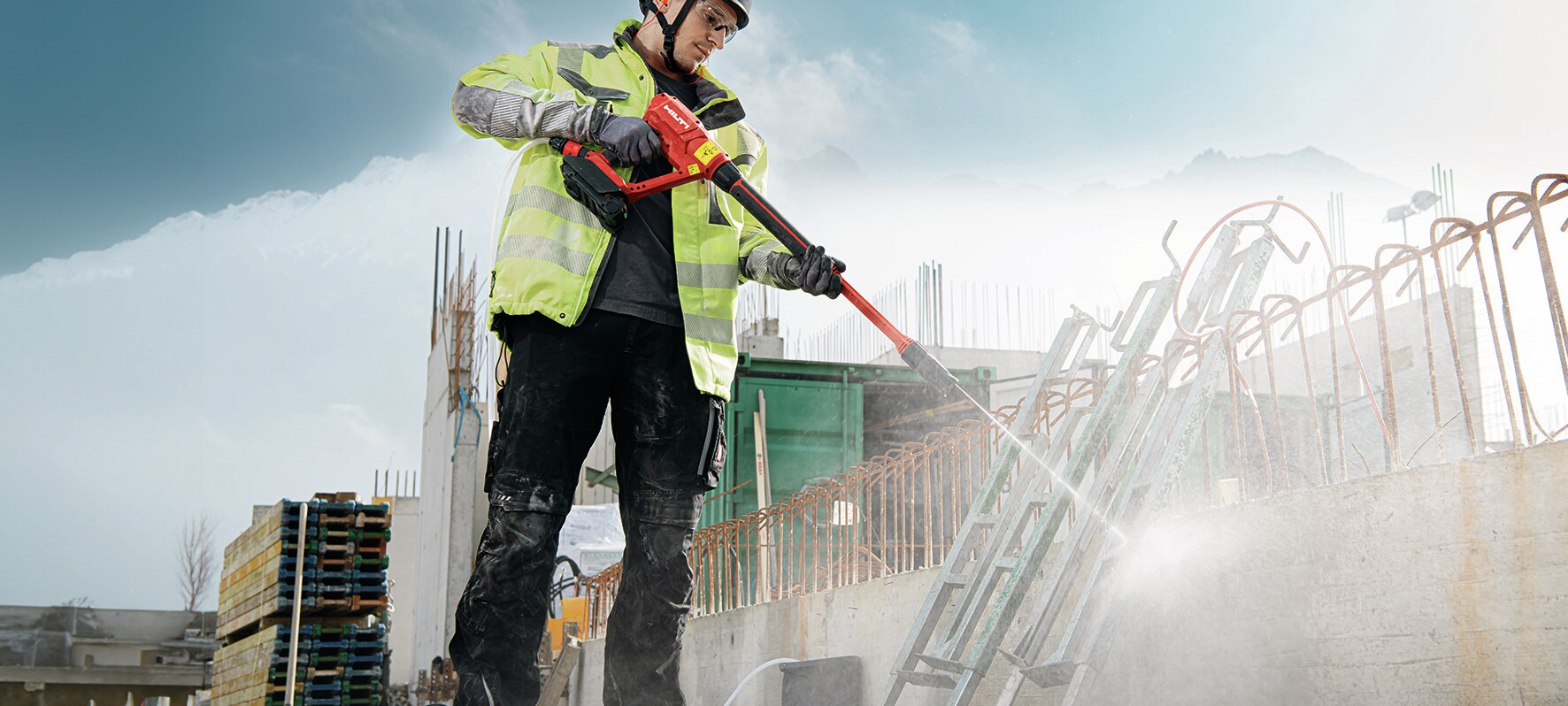 Prijenosni niskotlačni čistač s radnim tlakom od 40 bara (580 PSI), za lagano čišćenje oko gradilišta (Nuron baterijska platforma).